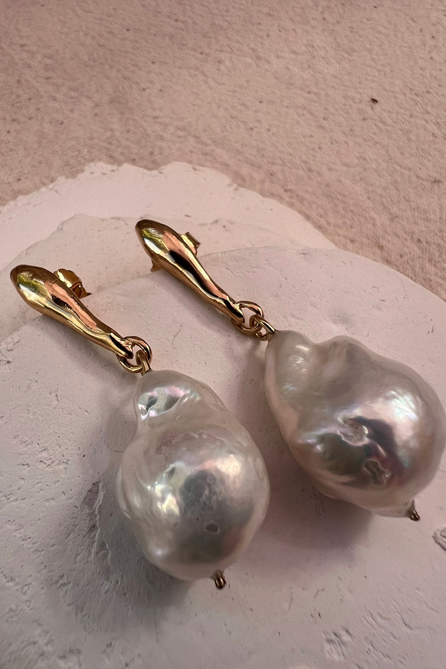 Aros de bronce y plata 950, enchapados en oro 18k y perlas barrocas. Edición limitada.
